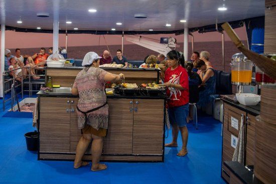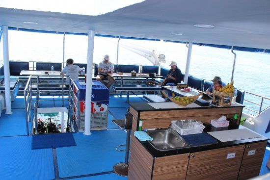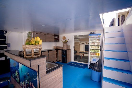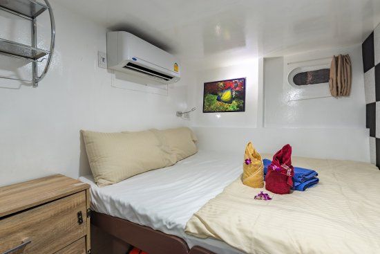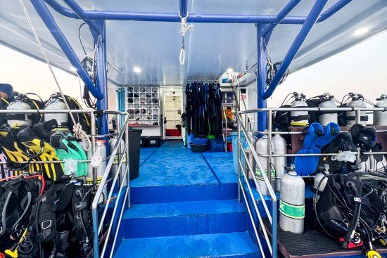 An Bord erwarten dich komfortable Kabinen mit Klimaanlage, eine großzügige Tauchplattform, moderne Sicherheitsausstattung, Nitrox-Anlage, ein gemütlicher Salon sowie eine hervorragende Küche. Die maximale Gästeanzahl beträgt 24 Personen – getaucht wird in kleinen Gruppen mit maximal 6 Tauchern pro Guide.